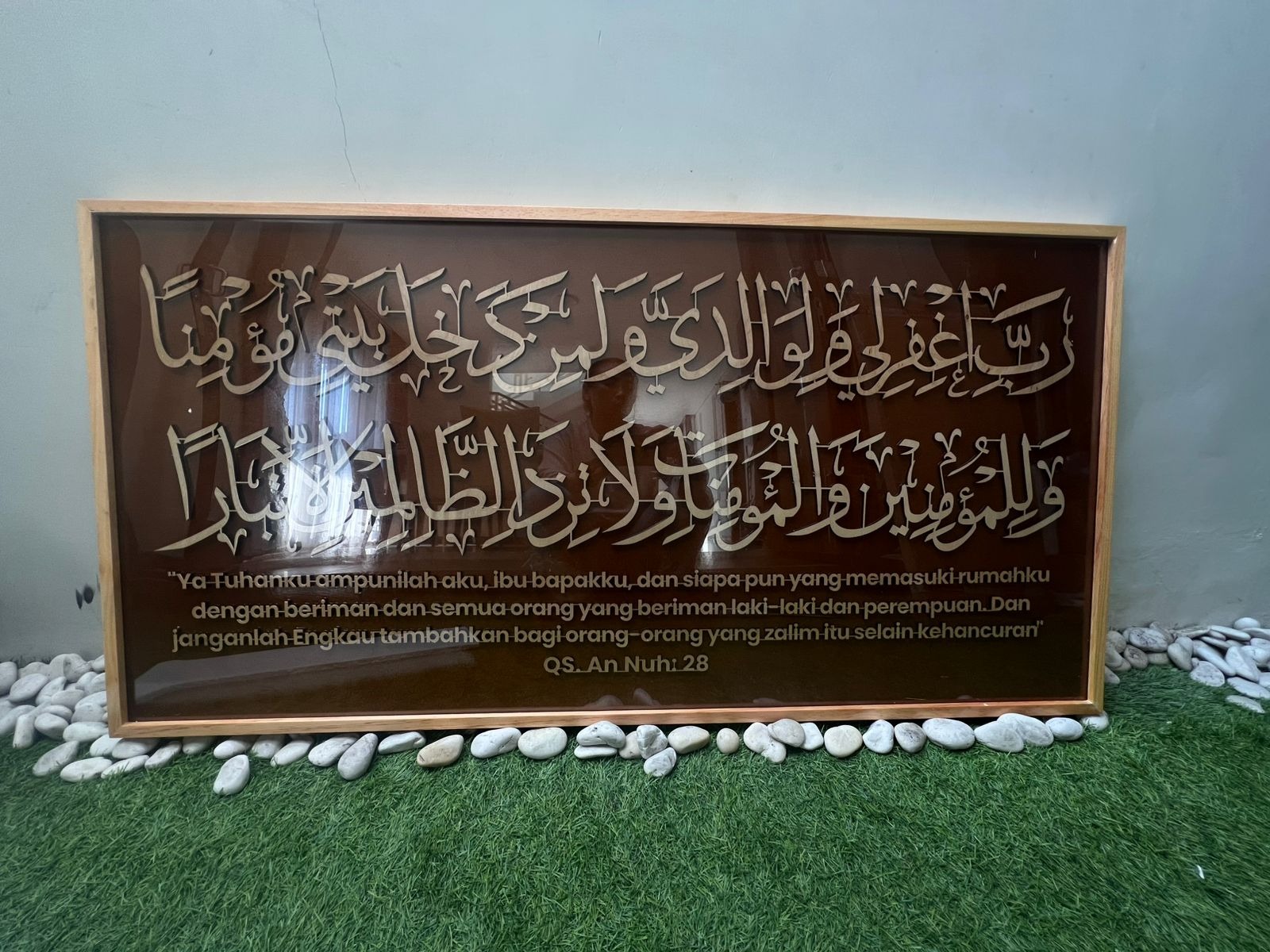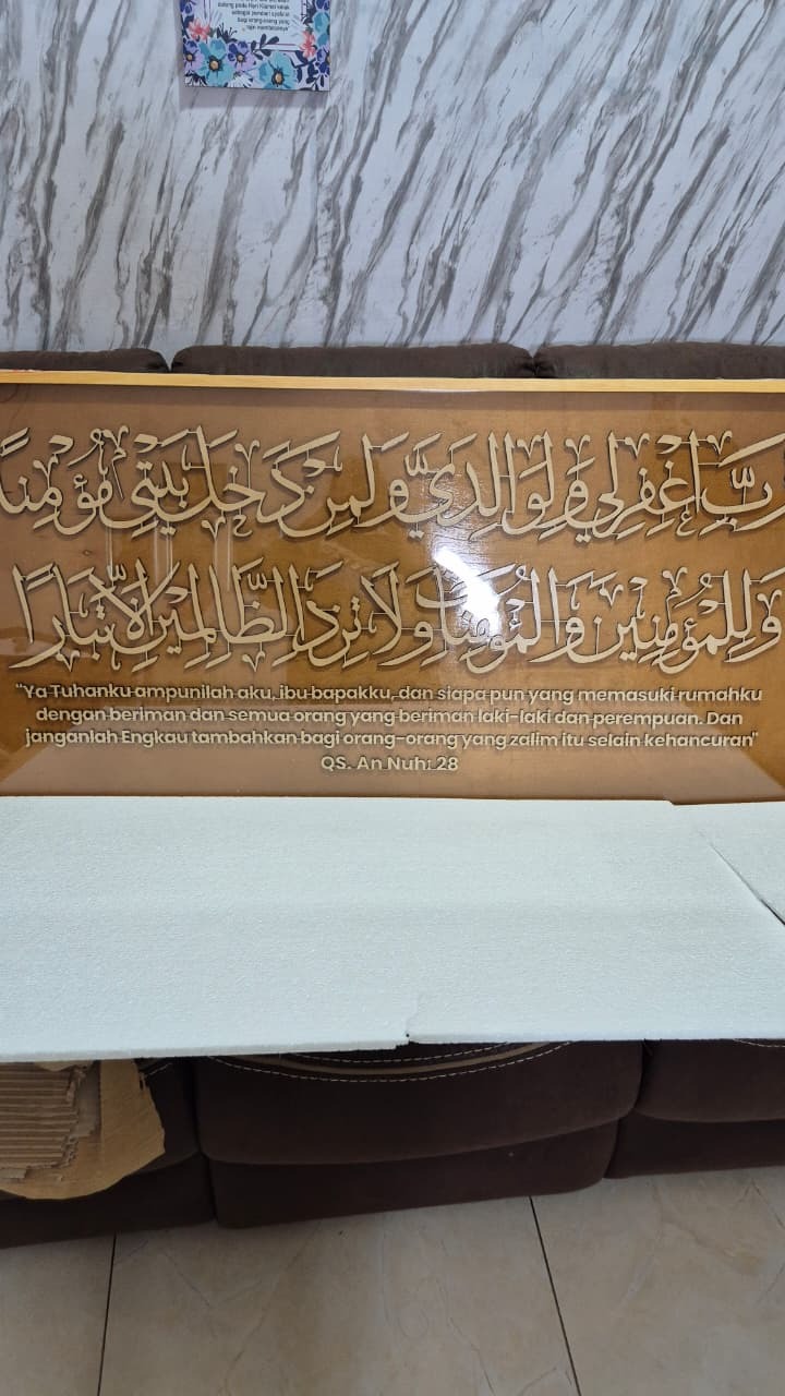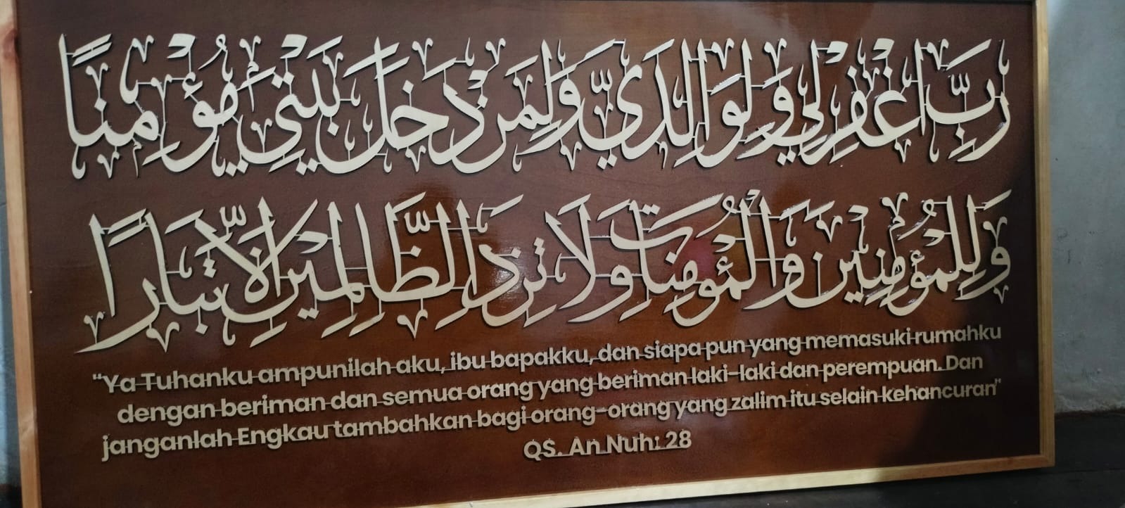 - Bahan frame kayu pinus background dan tulisan palywood premium